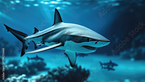 Fototapeta premium Great White Shark swimming underwater with aquatic ecosystem and marine life, predator, ocean, wildlife, and dangerous sea creature.