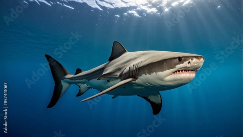 Fototapeta premium Great white shark swimming underwater with sun rays above, close-up view highlighting teeth and powerful body