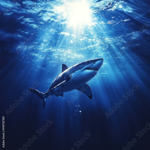 Fototapeta premium Great White Shark Swimming Upwards Towards Sunlight in Deep Blue Ocean