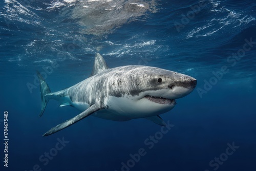 Naklejka premium Great White Shark swims gracefully in deep blue waters near an underwater...