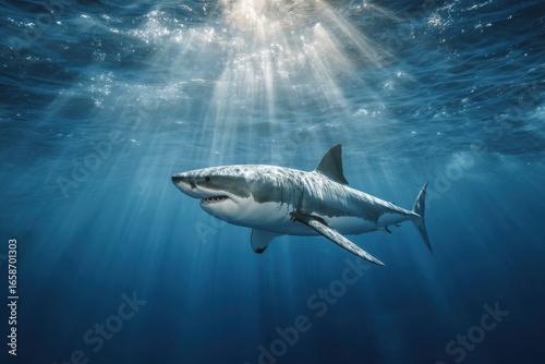 © Iftikhar alam, Naklejka premium Great white shark swims gracefully in the clear blue waters of the Pacific Ocean during midday, showcasing its majestic form and natural behavior in the wild
