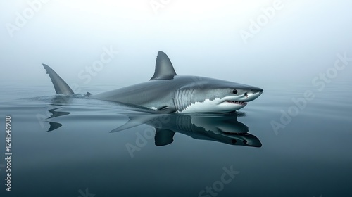Fototapeta premium Great white shark swims in foggy ocean; wildlife documentary