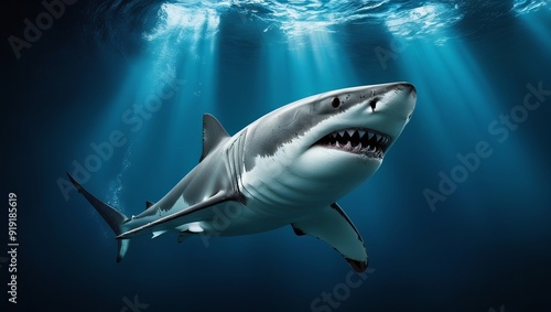 © Prashant, Fototapeta premium Great White shark under sea water cinematic