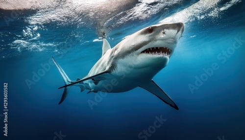 © netsay, Naklejka premium Great White Shark Underwater at Twilight, Majestic Predator Swimming Gracefully Amidst BlueGreen Abysmal Depths, Capturing the Enigmatic Beauty and Power of the Oceans Apex Predator.