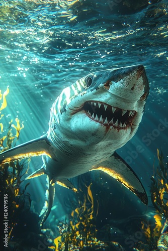 Fototapeta premium Great White Shark Underwater Kelp Forest Scene