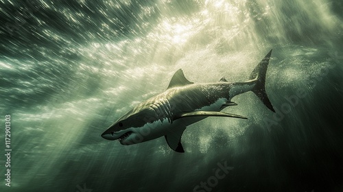 Fototapeta premium Great white shark underwater, sunlight rays.