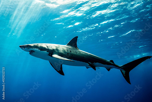 Fototapeta premium Great white shark view in depth of sea; clear turquoise waters