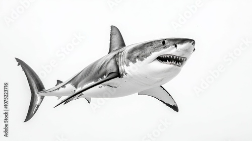 Obraz premium Great white shark with open mouth, swimming in profile, sharp teeth visible, full-length, isolated on a white background