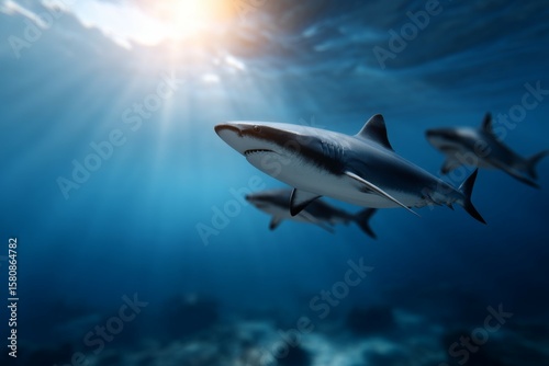 Fototapeta premium Great white sharks swimming in sunlit ocean depths