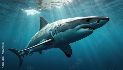 Fototapeta premium Great white swims in deep blue ocean water. Powerful marine predator shows sharp teeth and fins. Sun rays shine through surface above this apex hunter.