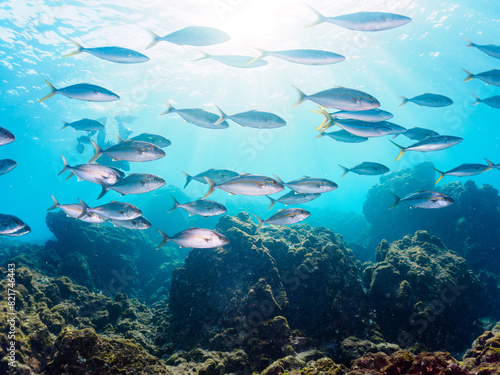 © d3_plus, Fototapeta premium キビナゴの大群を襲う迫力あるカンパチとツムブリ(アジ科)の群れ。日本国静岡県伊豆半島賀茂郡南伊豆町中木から渡し船で渡るヒリゾ浜にて。 2022年夏水中撮影。Greater Amberjack (Seriola dumerili) and Rainbow Runner (Elagatis bipinnulata) (horse mackerel family) attacking a lar