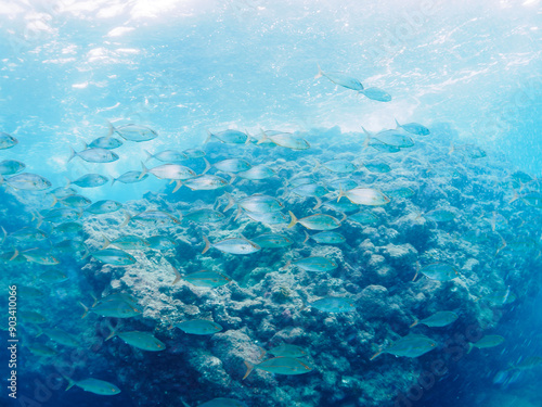 Fototapeta premium キビナゴの大群を襲う迫力あるカンパチ(アジ科)の群れ。日本国静岡県伊豆半島賀茂郡南伊豆町中木から渡し船で渡るヒリゾ浜-2024年7月Greater...