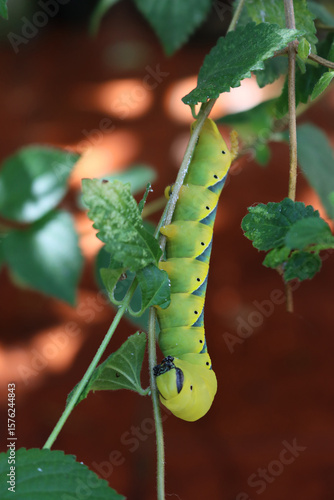 Naklejka premium Greater Death's Dead Hawk-moth caterpillar on a Lantana plant. Acherontia atropos caterpillar eating a plant