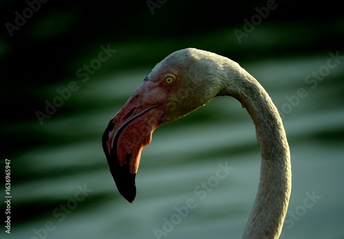 © Colin, Fototapeta premium Greater flamingo (Phoenicopterus roseus) in natural wetland – elegant pink bird wading in shallow water