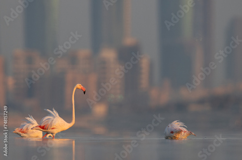 © Dr Ajay Kumar Singh, Fototapeta premium Greater Flamingos feeding and wading at Eker creek in the morning, Bahrain