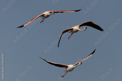 © Dr Ajay Kumar Singh, Fototapeta premium Greater Flamingos flying at Mameer coast in the morning, Bahrain