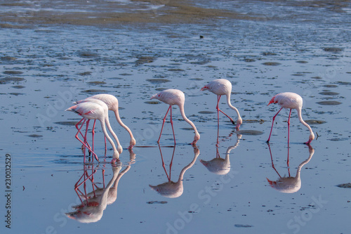 Fototapeta premium Greater Flamingos ( Phoenicopterus ruber roseus) eating with reflection on the surface, Walvis bay, Namibia.