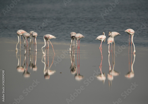 © Dr Ajay Kumar Singh, Fototapeta premium Greater Flamingos reflection while feeding at Eker coast, Bahrain