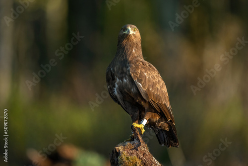 Naklejka premium Greater spotted eagle in the forest at morning light