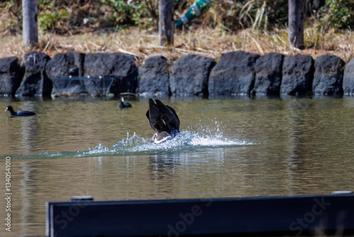 Fototapeta premium 八丈島では数年に一度しか飛来しない、貴重な 飛翔する美しく大きなマガン(カモ科) 英名学名:Greater white-fronted goose,...