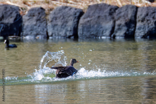 Fototapeta premium 八丈島では数年に一度しか飛来しない、貴重な 飛翔する美しく大きなマガン(カモ科) 英名学名:Greater white-fronted goose,...