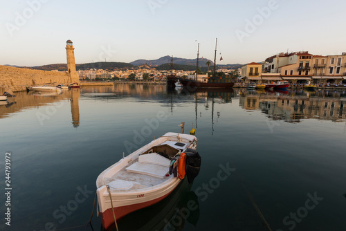 Fototapeta premium Greece, Crete Rethymnon, old venetian harbor, beautiful boats at the sunset..