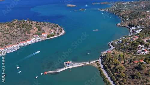 © Aytug Bayer, Fototapeta premium greece peloponnese region poros island houses clock tower and boats aerial view on daylight
