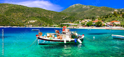 © Freesurf, Fototapeta premium Greece travel. Lefkad Ionian island. Picturesque small fishing village Mirkos Gialos