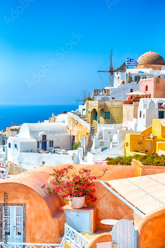 Naklejka premium Greece Traveling. View of Greek Traditional Colorful Houses and Windmills of Oia or Ia at Santorini Island in Greece at Daytime.