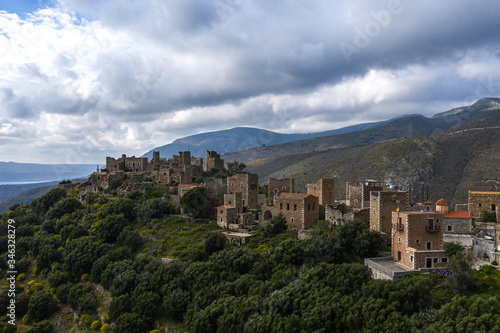 © Mariana Ianovska, Obraz premium Greece Vatheia village. Architectural and historical old traditional abandoned tower houses in Vathia on Mani Peninsula. Laconia Peloponnese Europe.