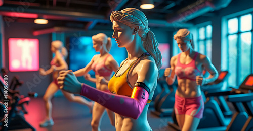 Obraz premium Greek-style female statues running on treadmills in a modern gym, combining classical art with contemporary fitness themes and vibrant lighting.