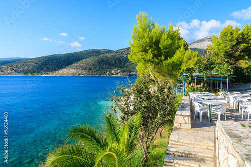 Naklejka premium Greek tavern restaurant on coast of Kefalonia island in Agia Efimia, Greece