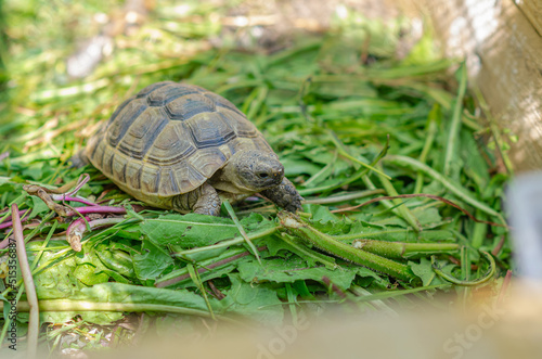 Fototapeta premium Greek turtles in an aviary. Enclosed natural environment for domestic...