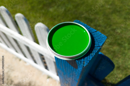 © WH_Pics, Fototapeta premium greem Paint can lid resting over fence pole.
