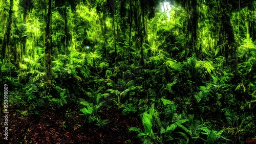 © Koto, Fototapeta premium Green abstract background with particles evoking a lush forest path