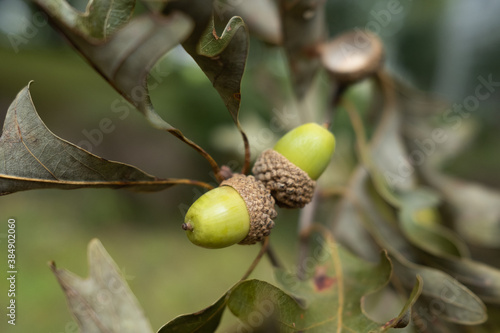 Obraz premium Green Acorns from an Oak Tree in the Early Autumn