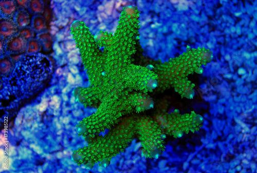 Fototapeta premium Green Acropora SPS coral under moonlight