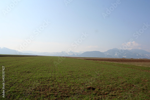 © Cenusa Silviu Carol, Fototapeta premium green agricultural field with snow-capped mountains in background