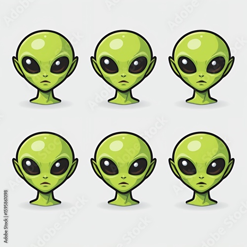 Obraz premium Green Alien Head Cartoon Character Set with Big Eyes on a Gray Background