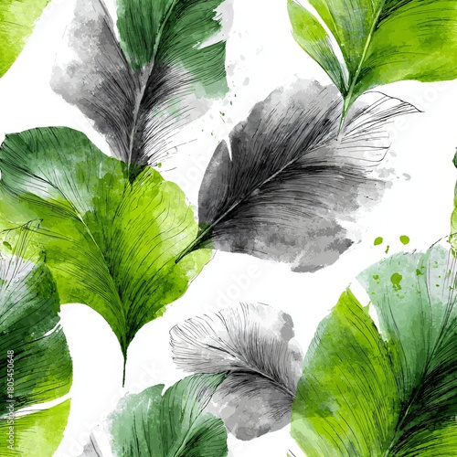 © Margarita Ratatosk, Naklejka premium Green and black foliage watercolor seamless pattern on white. Tropical leaf design with natural texture for textile, wallpaper, and fabric.