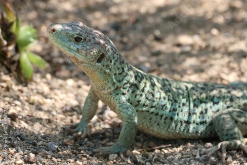 Obraz premium Green and black lizard on sandy ground
