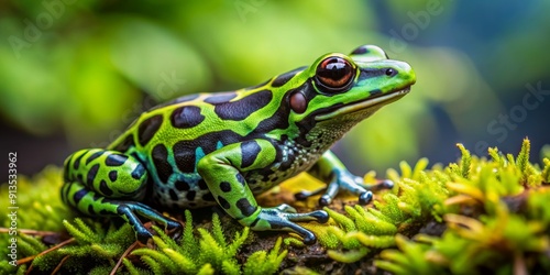 Fototapeta premium Green and Black Poison Dart Frog in Moss, Macro Photography, Amphibian,...