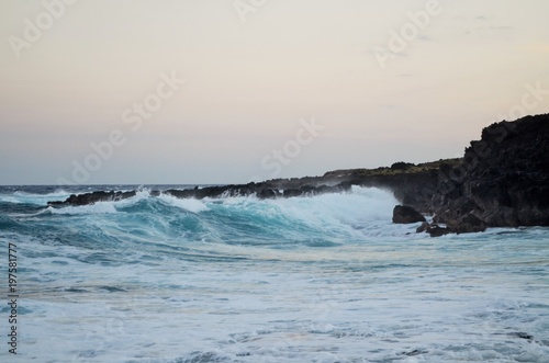 © zoeydsngwrtr, Fototapeta premium Green and blue tide black rock