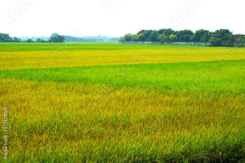 Fototapeta premium green and gold agriculture jasmine rice farm and soft fog in morning blue sky...