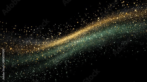 © Ameer, Fototapeta premium Green and gold glitter sparkling on dark black background festive shimmering luxury texture for elegant holiday party backdrop and glamorous celebration design
