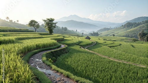 Fototapeta premium Green and lush rice paddies with a winding path, , rural scenery