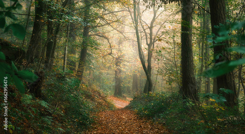 © Smileus, Naklejka premium Green and orange foliage in a misty autumn forest. Dreamy painterly landscape with atmosphere and depth