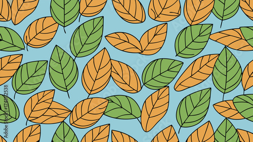 © lilyax, Fototapeta premium Green and orange leaves pattern on blue background seamless