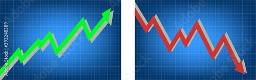 © Nuttaphol, Naklejka premium Green and Red indication arrow on screen dark blue reflection background. Investment opportunities and risks. statistic financial graphic. up and down of circle investment market. - vector