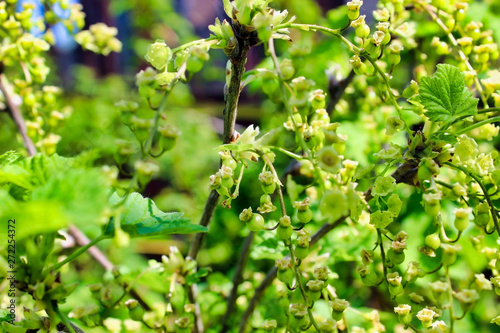 © Issah, Obraz premium Green and unripe currant berries on a branch in the garden. The bush is close-up. Back blurred color background with a green tint.